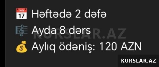 120 Azn Dersler ali təhsilli , magistr bitirmiş müəllim tərəfindən profesional keçirilir .qısa zamanda istədiyiniz musiqini ifa edə biləcəksiniz .Drslere 4 yaşdan başlayaraq her kes müraciət edə bilər .