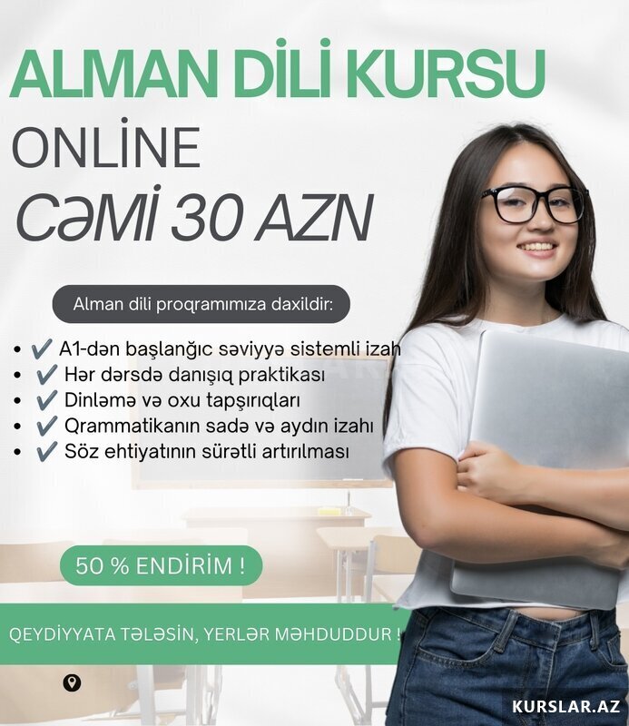 Şirkət45 Azn Xüsusi Qış Kampaniyası Alman dili online kursu Cəmi 30 AZN Peşəkar müəllimlər Rahat və uyğun qrafik Online dərslər Şirkətimizdə keçirilən digər kurslar: İngilis dili Rus dili Kompüter kursları Qrup və fərdi dərslər