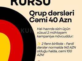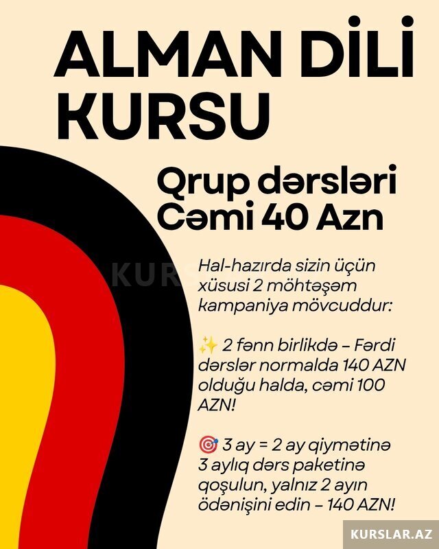 Şirkət40 Azn ALMAN DİLİ KURSLARI - İNDİ BAŞLA, SABAH DANIŞ! Alman dili öyrənmək istəyirsən amma haradan başlayacağını bilmirsən? Bizimlə həm asan, həm sistemli, həm də nəticəyə yönümlü şəkildə öyrən! Danışıq yönümlü proqram Sıfırdan