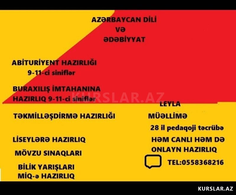 50 Azn Azərbaycan dili və Ədəbiyyatı hazırlığı. Online və ya əyani. İki il təcrübə. Ödəniş 15manat . Ödəniş ilk həftə alınır .5-8təkminləşdirmə, 10-11 abituriyent hazırlığı.