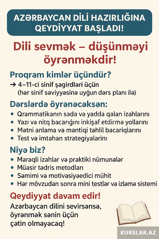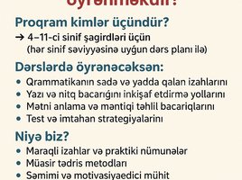 5–8-ci siniflər üçün qrammatika və mətn üzərində işləmə bacarığının inkişafı 9–11-ci siniflər üçün buraxılış və qəbul imtahanlarına hazırlıq Bütün mövzular sıfırdan, sadə və izahlı şəkildə öyrədilir