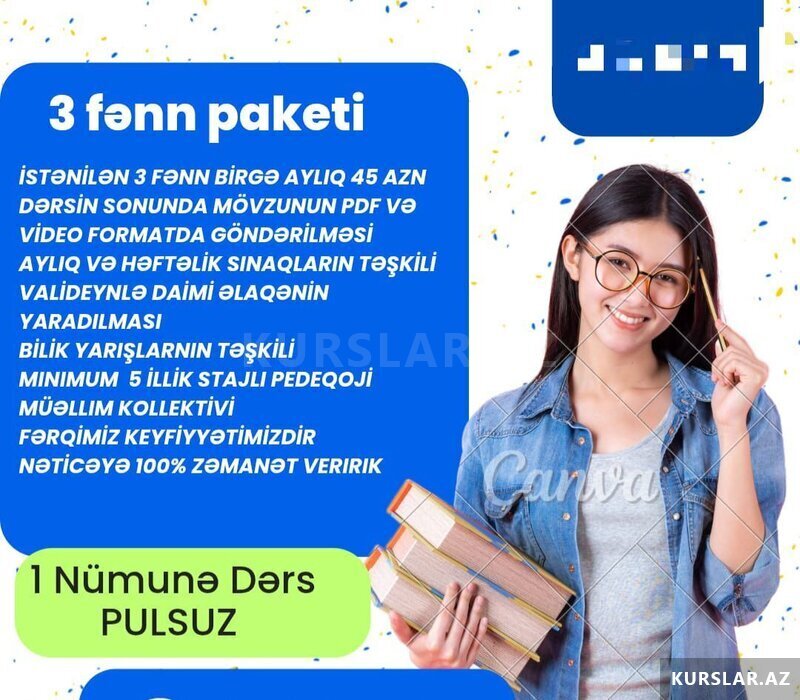 25 Azn Yalnız. Onlayn! Azərbaycan ali məktəblərinə qəbul olmaq istəyən abituriyentlərin 5 əsas fənn üzrə (Azərbaycan dili, Riyaziyyat, İngilis dili, Tarix, Coğrafiya və ya digər seçim fənləri) imtahanlara maksimum nəticə ilə