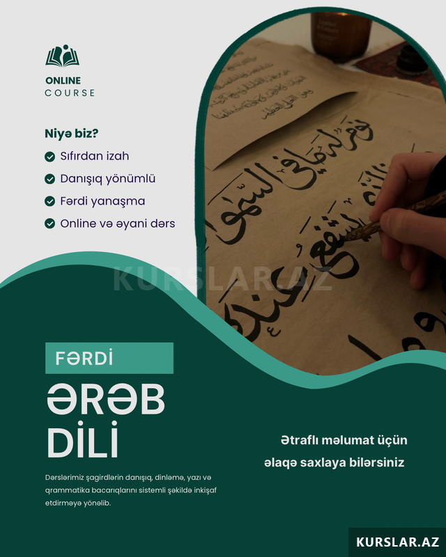 Ərəb dili kursları. Dərslər təcrübəli müəllim tərəfindən keçirilir. Dərslər həftədə 3 dəfə 1 saat və ya 2 dəfə 1.5 saat keçirilir.