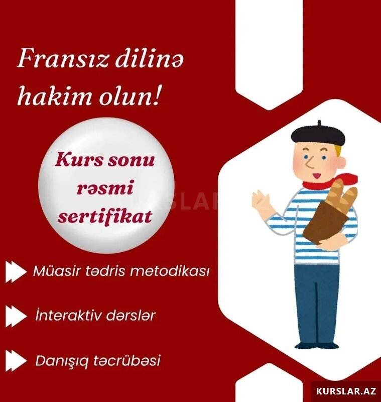 50 Azn Fransiz dili kursu ferdi individual İndi bir Fransız gəlsə rahat danışa bilərsən? Sualına düşünmədən Hə! Cavabı vermək istəyirsənsə tam da doğru elanı oxuyursan. Dərslər yüksək ixtisaslı müəllimlər tərəfindən xüsusi
