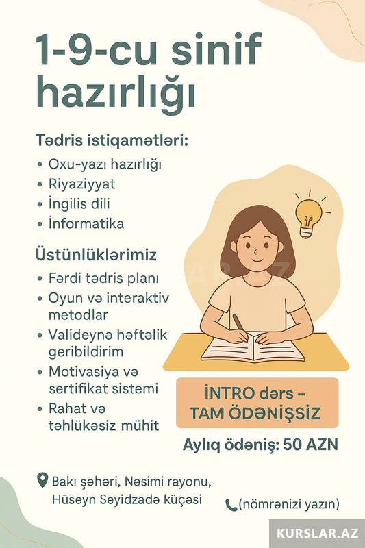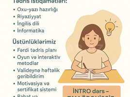 30 Azn Uşağınızın məktəbə hazırlığını təmin edin! Məktəbəqədər və ibtidai sinif şagirdləri üçün fərdi və qrup dərsləri Həftədə 4–5 dəfə, hər dərs 1 saat 30 dəqiqə Oxuma, yazma, riyaziyyat və ümumi inkişaf bacarıqları Ev