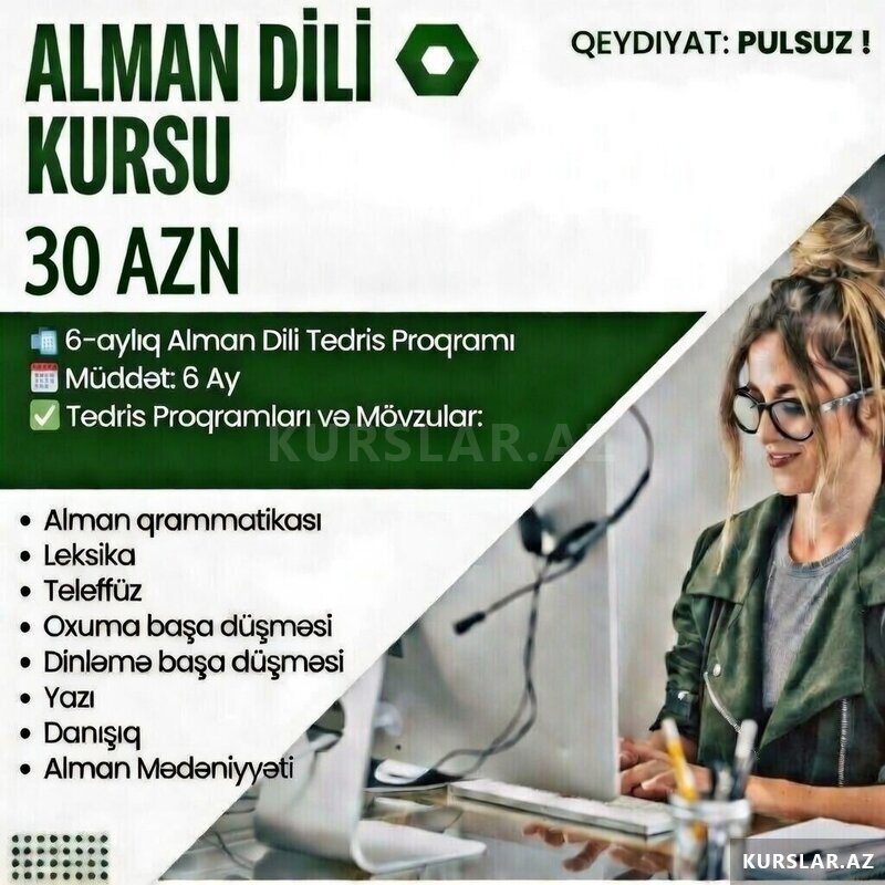 Şirkət25 Azn lman dili kursuna qeydiyyat başladı! Qrup dərsləri - 30 AZN Fərdi dərslər - 50 AZN Aylıq əlavə paket - 89 AZN Bundan əlavə kurslarımız: İngilis dili Rus dili Kompyuter kursları Məktəbəqədər hazırlıq Keyfiyyətli tədris,