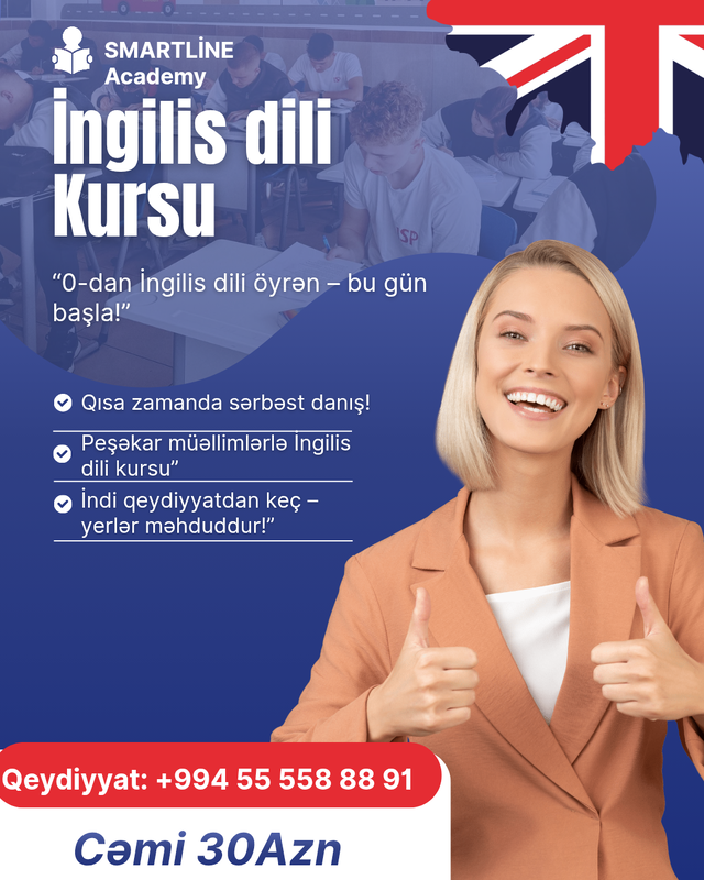 Şirkət30 Azn Smart Line Academy-dən möhtəşəm fürsət! Bütün İngilis dili qrup dərsləri cəmi 30 AZN! Yerlər məhduddur - gecikən uduzur! İngilis dili proqramımıza daxildir: Grammar sıfırdan və sistemli izah Hər dərsdə Speaking