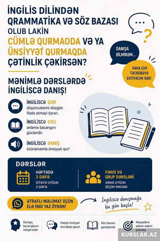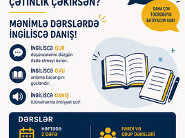 15 Azn Mən ingilis dili hazırlığı keçirəm. Dərslərim keyfiyyətli və nəticəyönümlüdür. Həftədə 3 dəfə keçirilən dərslərdə: Dnışıq bacarıqlarınızı inkişaf etdirəcəyik, Qrammatikanı sadə və anlaşılan şəkildə