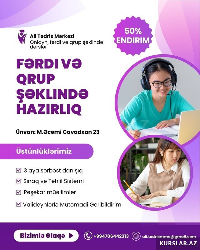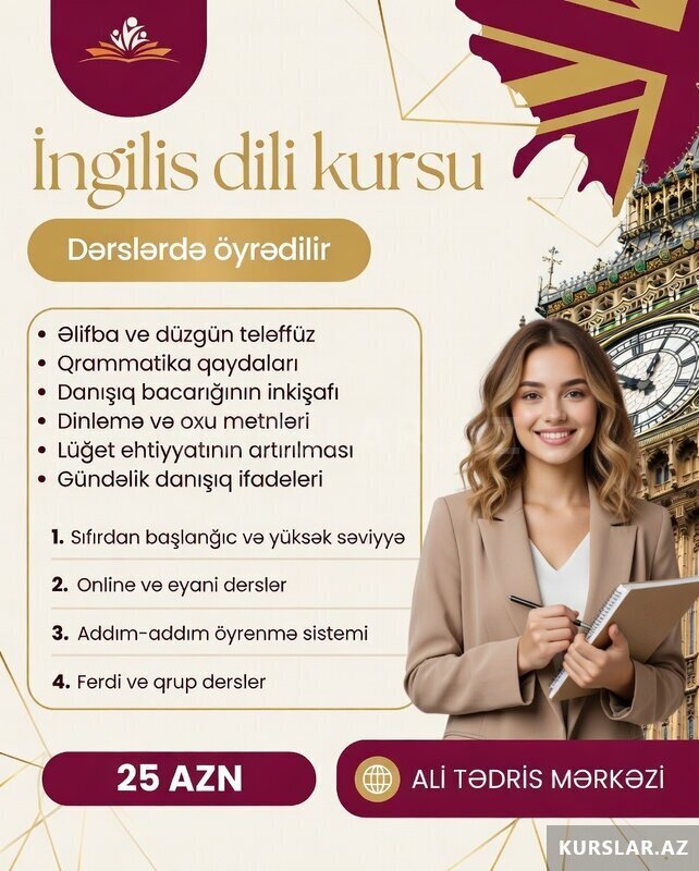 Şirkət30 Azn 3 AYA ÖYRƏN - İNDİ BAŞLA! TƏDRİS OLUNAN KURSLAR İngilis dili (onlayn) - 25 AZN Rus dili (onlayn) - 30 AZN Alman dili (onlayn) - 30 AZN Kompüter kursu (onlayn) - 30 AZN Qrup əyani dərslər - 50 AZN Fərdi dərslər - 89