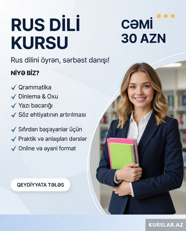 Şirkət30 Azn 3 AYA ÖYRƏN - İNDİ BAŞLA! TƏDRİS OLUNAN KURSLAR İngilis dili (onlayn) - 25 AZN Rus dili (onlayn) - 30 AZN Alman dili (onlayn) - 30 AZN Kompüter kursu (onlayn) - 30 AZN Qrup əyani dərslər - 50 AZN Fərdi dərslər - 89