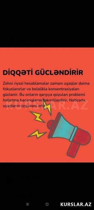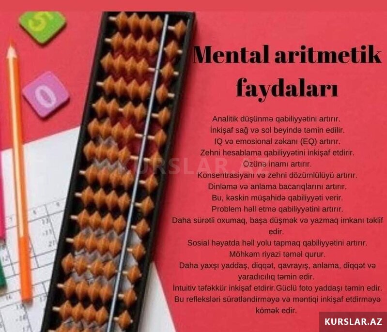 Mental Arifmetika dərsləri 5-14 yaş arası uşaqlarda yaddaş, diqqət və sürətli düşünmə bacarıqlarını inkişaf etdirən effektiv metodikadır, xüsusi proqramdır.