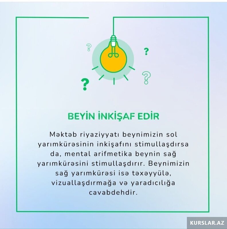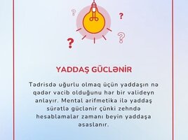 Mental Arifmetika dərsləri 5-14 yaş arası uşaqlarda yaddaş, diqqət və sürətli düşünmə bacarıqlarını inkişaf etdirən effektiv metodikadır, xüsusi proqramdır.