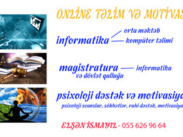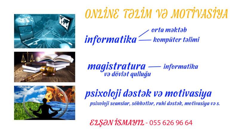 İxtisasca təhsilli informatika müəllimi və eyni zamanda yazar, psixoloq, rejissor kimi fəaliyyət göstərən ELŞƏN İSMAYIL sizlərə orta məktəb matrealı üzrə və magistratura, dövlət qulluğu üzrə informatika, kompüter təlimi, eyni zamanda psixoloji dəstək və motivasiya seansları təklif edir. Maraqlananlar (Qeyd: pandemiya ilə əlaqədar olaraq təlim online, pandemiyadan sonra isə vip (evlərə getmə) xidmət göstərir..