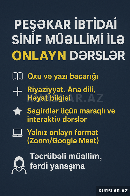İbtidai sinif müəllimliyi üzrə ixtisaslı pedaqoqam. Hazırda ibtidai sinif şagirdləri üçün fərdi və qrup hazırlığı həyata keçirirəm.