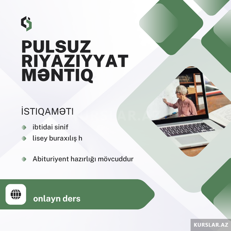 50 AznRiyaziyyat və Məntiq Dərsləri (5-9-cu siniflər üçün) Şagirdinizin riyaziyyatda çətinlik çəkməməsini və bu fənni sevərək öyrənməsini istəyirsiniz? Sadə, başa düşülən və motivasiyaedici üsullarla dərslər keçirəm.
