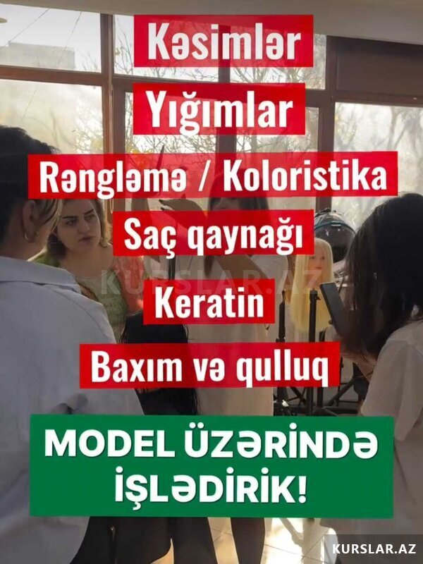 Dərs proqramı: Kursa müxtəlif növ kəsimlər, muncuqlu qaynaqlar, mikroqaynaq, tikiş qaynağı, saçların rənglənməsi, ombre, balyaj, refle, gündəlik düzləşdirmə, günlük, ziyafət və gəlin saç düzümləri və s nəzəri və praktiki biliklər daxildir.