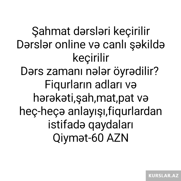 60 AznŞAHMAT DƏRSLƏRİ Dərslər Beynəlxalq Ustalar və Qroysmesterlər tərəfindən keçirilir Dərslər Azərbaycan, Rus və İngilis dilində aparılır Şahmat ilə bağlı təməl biliklər, 4-cü, 3-cü, 2-ci, 1-ci dərəcələr üçün və həmçinin