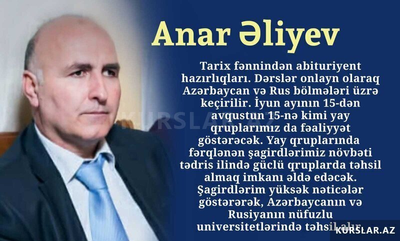 Tarix müəllimi Anar Əliyev. 2013 ildən onlayn abituriyent hazırlığı. MİQ VƏ SERTİFİKASİYA imtahanlarına hazırlıq kursları.Hazırladığım abituriyentlər BDU-nun hüquq fakültəsi, Azərbaycan Dövlət İqtisa [читат далше]